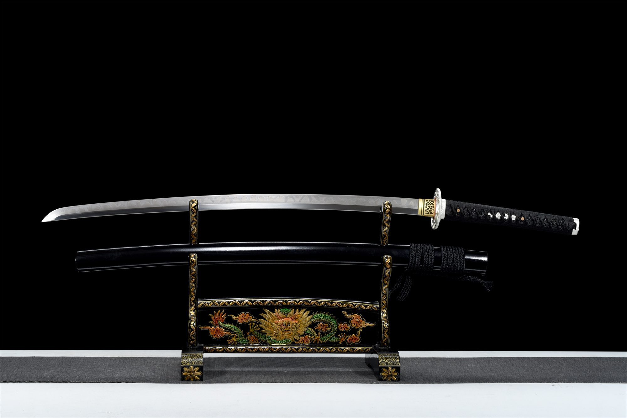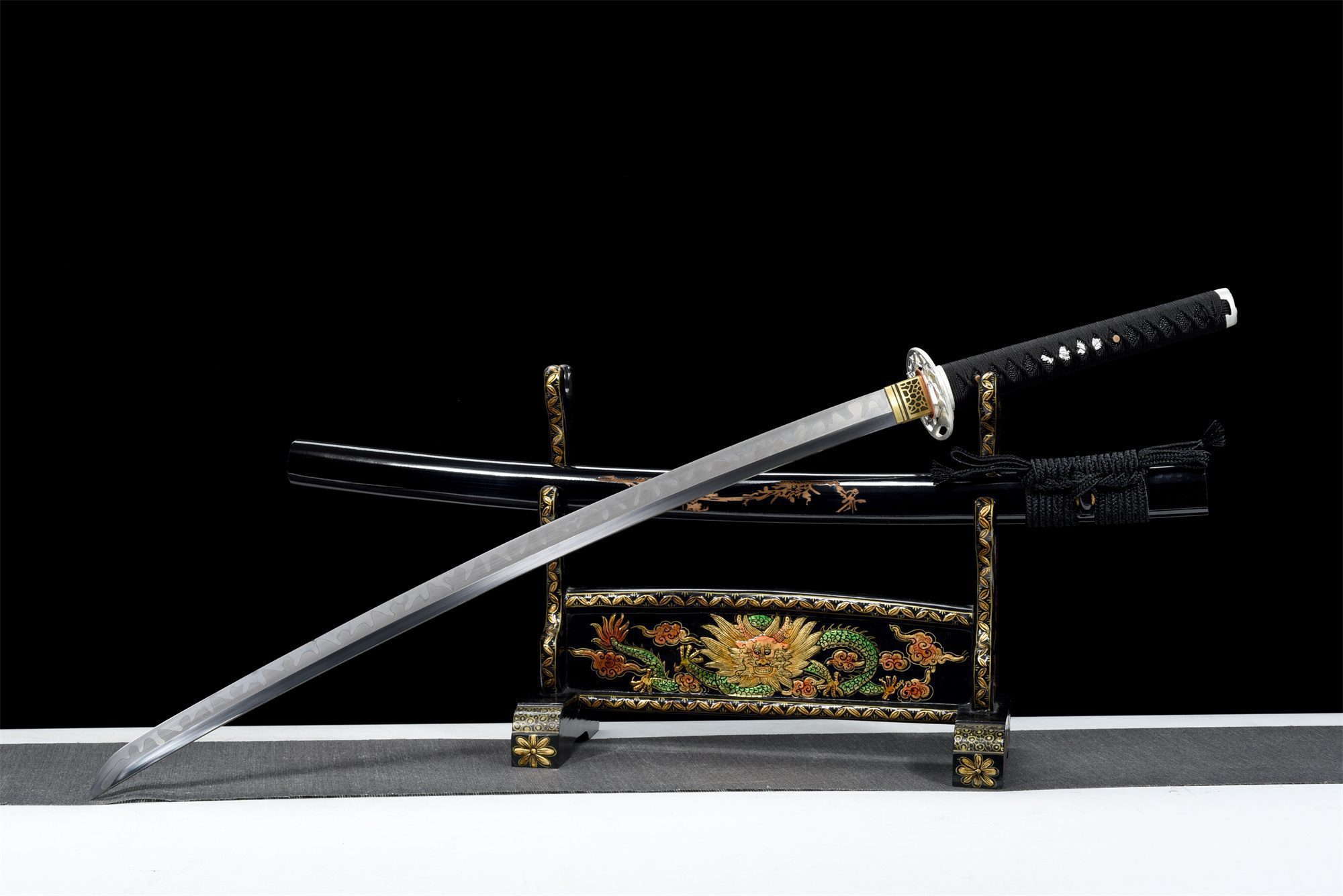 Het T10-stalen lemmet heeft een natuurlijke staalkleur die een subtiele hamon onthult, een bewijs van traditionele differentiële harding. De afgeronde verzilverde legering tsuba is voorzien van een gegraveerd boommotief, dat symbool staat voor groei en doorzettingsvermogen door de seizoenen heen. Het handvat combineert op harmonieuze wijze massief hout en zwart imitatie roggenleer, terwijl de zwarte tsuka-ito-vlechtwerk met ruitpatroon zorgt voor een stevige en elegante grip. De menuki stellen fijn gebeitelde zilveren draken voor, bewakers van voorouderlijke wijsheid, terwijl de bijpassende fuchi en kashira delicate bloemmotieven op een zilveren achtergrond hebben. De vergulde messing habaki contrasteert met zijn zwarte patronen en zorgt voor een opvallend visueel effect. De zwartgelakte massief houten schede is versierd met bamboeschilderingen, die flexibiliteit en veerkracht in tijden van tegenspoed oproepen.