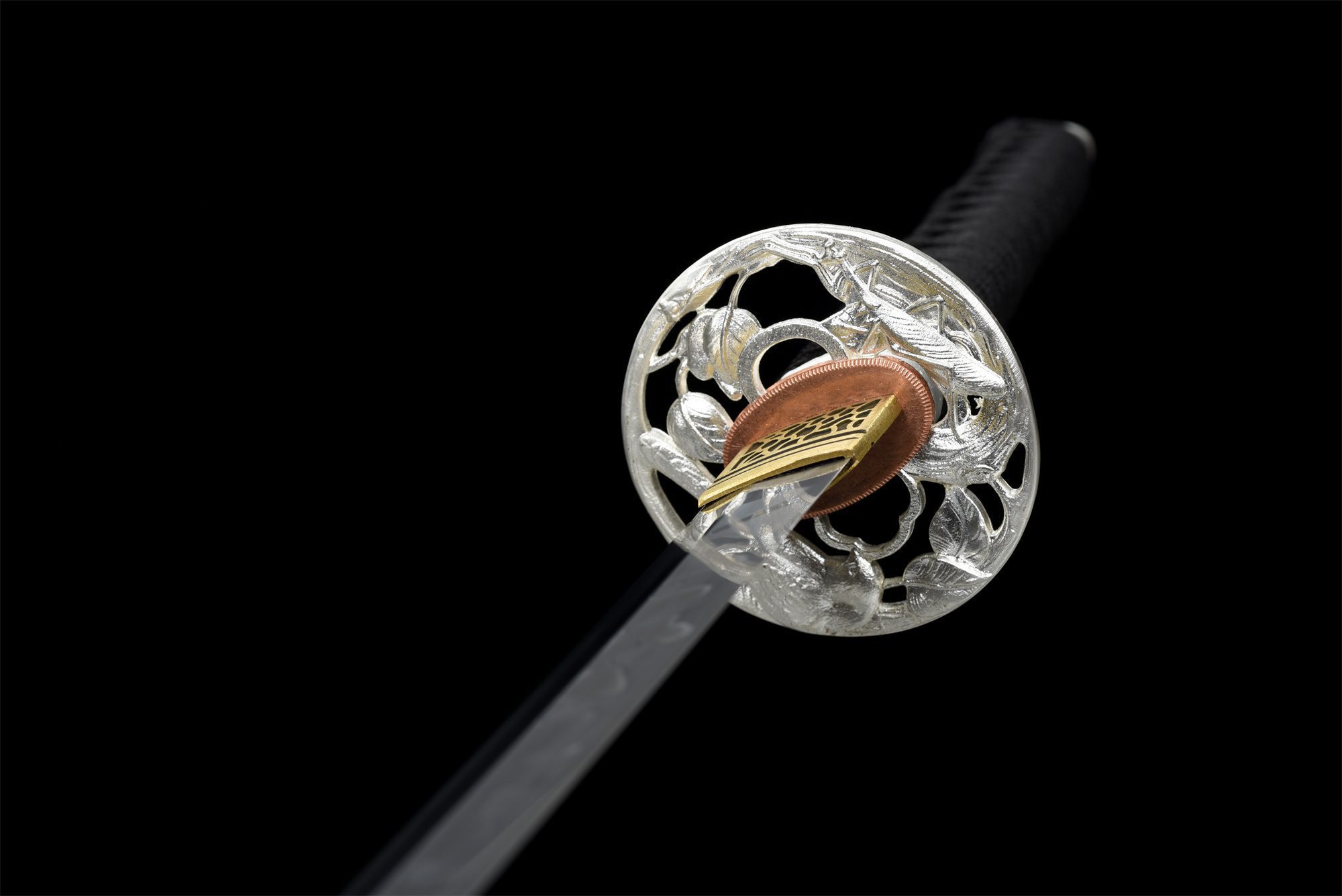 - Fuchi (縁): gegraveerd met bloemmotieven.