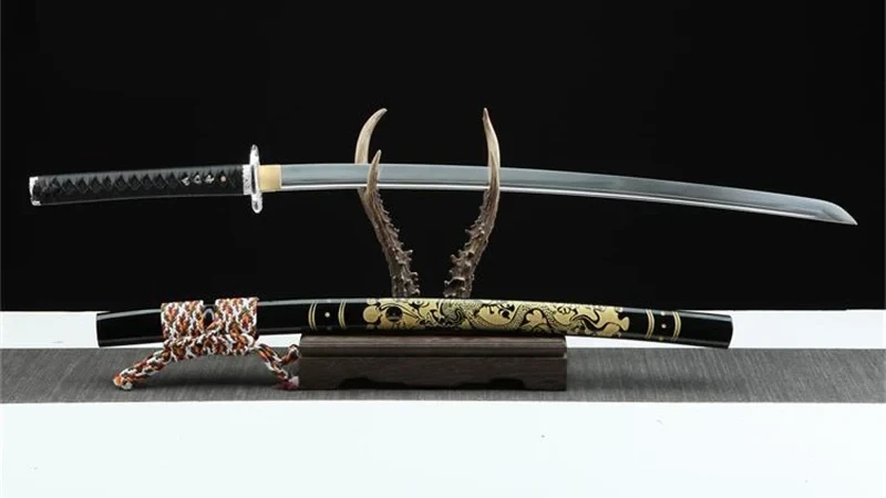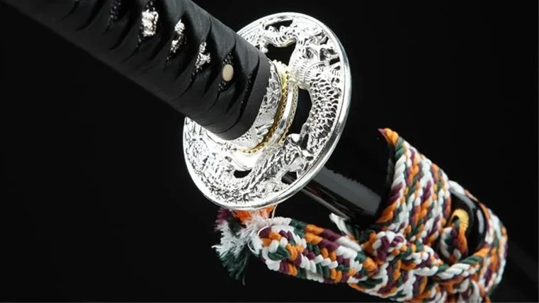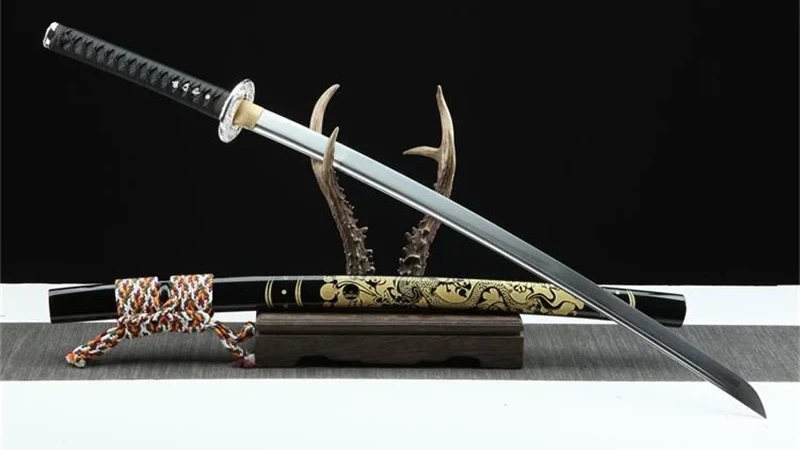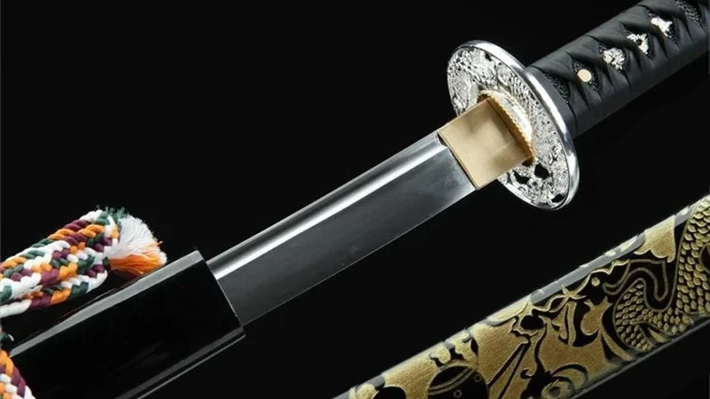 Maak kennis met de Yorutatsu (夜竜),“Nachtdraak”, een uitzonderlijk katana-zwaard gesmeed uit T10-staal. Het onderscheidt zich door zijn zwartgelakte houten schede, versierd met een vergulde draak, en door zijn ronde zilveren beschermkap met een uitgesneden draak. Dit katana belichaamt de kracht en mysteries van de nacht.