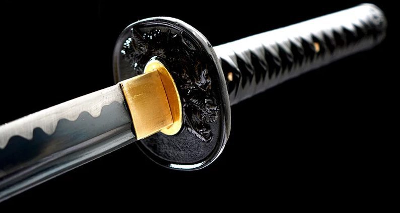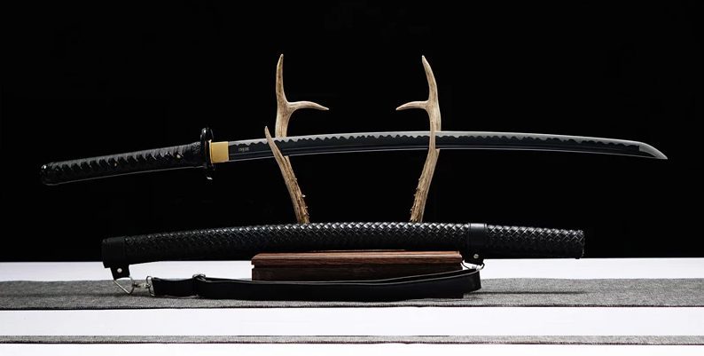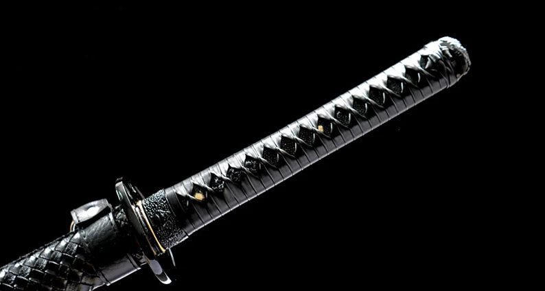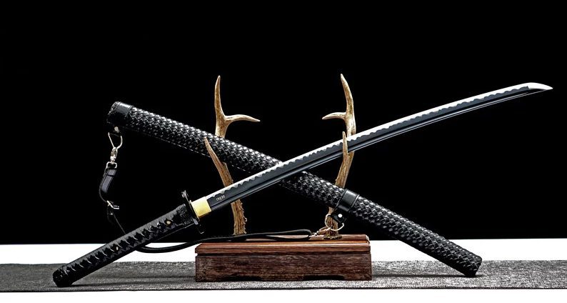 Het 1045 stalen lemmet van deze zwarte katana is verkrijgbaar in geslepen of ongeslepen uitvoering. De golfvormige hamon valt op dankzij het zwarte lemmet. De houten schede is bekleed met gevlochten zwart PU-leer, net als het handvat, voor een hoogwaardig zwart katana-zwaard.