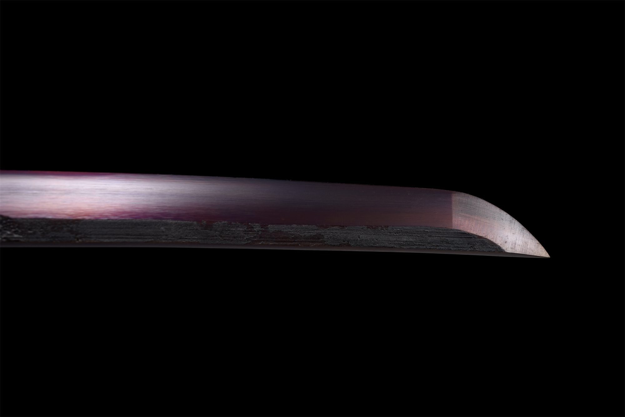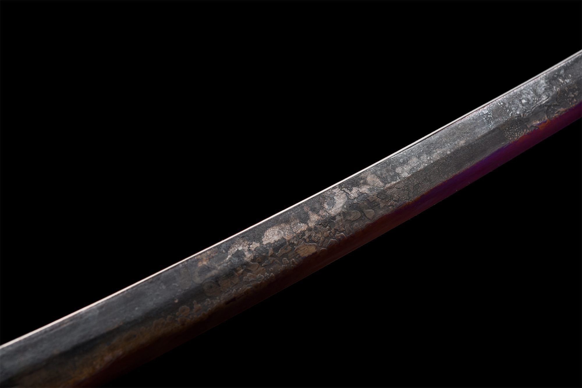 - Blauw gepatineerd mangaanstalen lemmet met zilveren, paarse en rode accenten, naar keuze geslepen of ongeslepen, volledige tang.