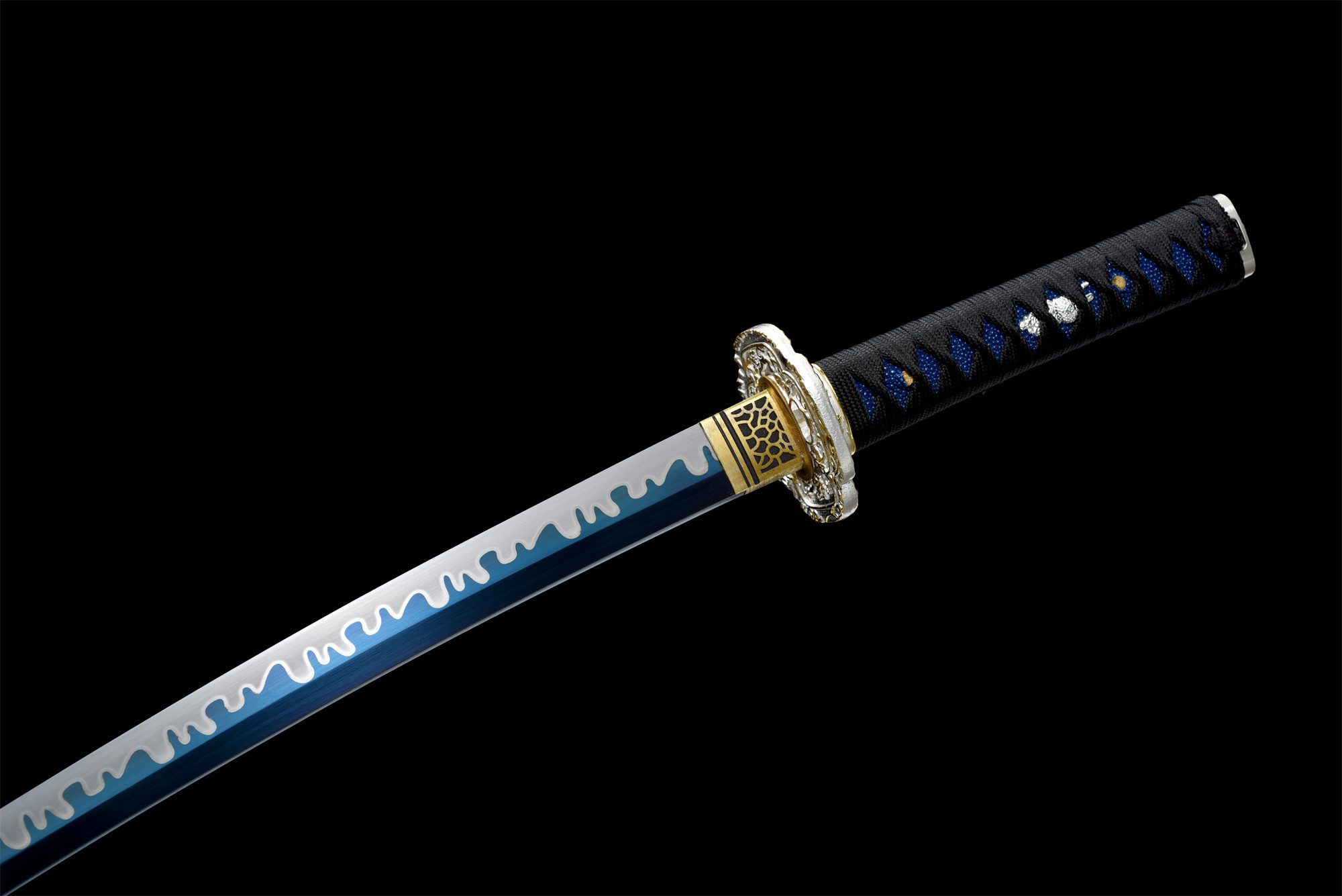 Het mangaanstalen lemmet heeft een prachtige blauwe tint die doet denken aan de koude vlammen van een slapende vulkaan, terwijl de zichtbare hamon golvende lijnen langs de snede volgt. De kruisvormige tsuba, fijn gebeiteld in zilver- en goudtinten, contrasteert elegant met dit azuurblauwe lemmet. Het massief houten handvat, bedekt met blauwe imitatie roggenhuid, biedt een veilige en comfortabele grip, versterkt door het zwarte diamantpatroon van de tsuka-ito. De menuki met afbeeldingen van zilveren draken voegen een mystieke dimensie toe aan het geheel, terwijl de fuchi en kashira, die bij de tsuba passen, de visuele harmonie behouden. De massief houten schede, gelakt in een zwart-blauw kleurverloop, maakt deze ijzige esthetiek compleet met zijn tweekleurige sageo.