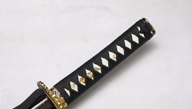 - Tsuka (柄): hardhouten handvat, PU wit Samegawa, vergulde Menuki.