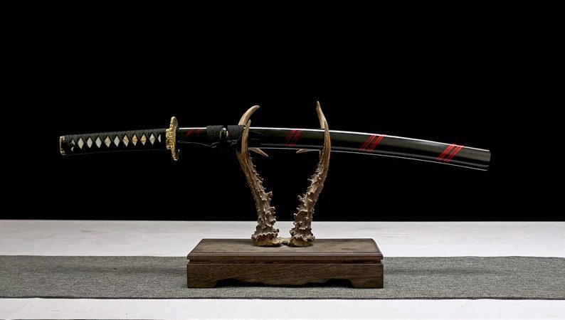 Deze zwarte wakizashi, met de hand gesmeed door onze ambachtelijke zwaardsmeden, heeft een lemmet van 1045 staal met een golfvormige hamon. Het slijpen van het lemmet is optioneel. De zwartgelakte houten schede is versierd met handgeschilderde rode lijnen, wat een prachtige kleurencombinatie oplevert.