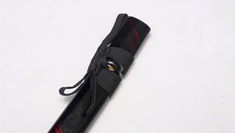 - Saya (鞘): zwartgelakte houten schede met dunne rode lijnen.